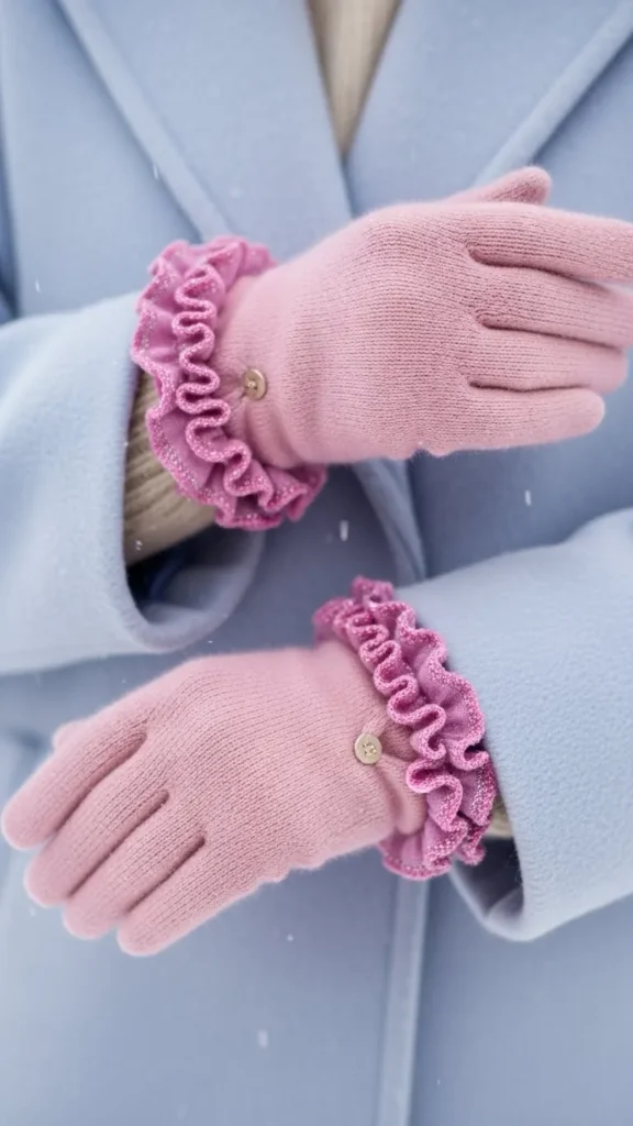 Ruffled gloves look feminine and romantic. They pair well with coats in pastel or soft shades. Acrylic and wool blends often give the best ruffled effect. For a DIY version, add fabric ruffles or lace trim around the glove wrist using a needle and thread. This easy project can brighten a plain pair of gloves cheaply.