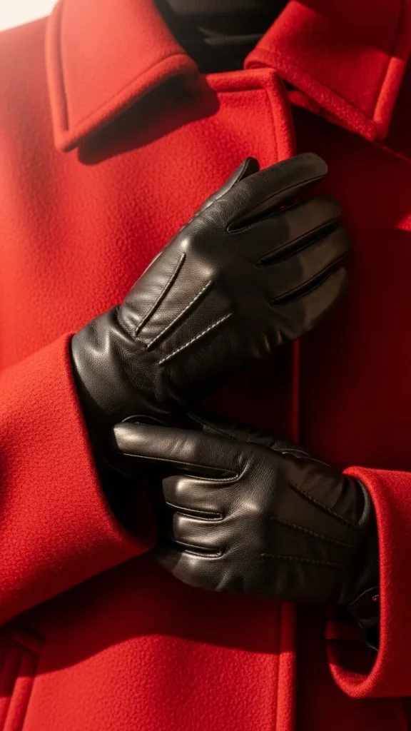 Black gloves with a bold red coat create a striking contrast. This combination is easy to put together and looks classy instantly. For a wallet-friendly approach, look for black gloves in thrift shops or sales. Ensure gloves fit well for a neat finish. This outfit is elegant without spending extra on accessories.