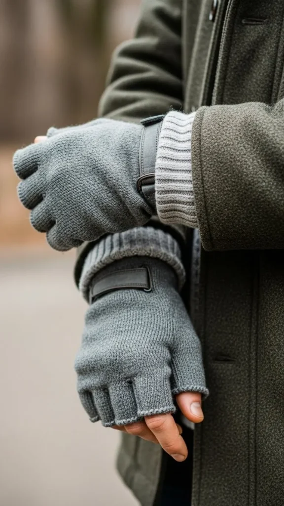 Fingerless gloves offer warmth while letting you use your phone or hold small items easily. Pair them with layered shirt or sweater sleeves for a stylish look. You can create your own fingerless gloves by cutting off the fingers from old knit gloves and hemming the edges neatly. This is a great way to reuse old gloves and add convenience to your winter wear.