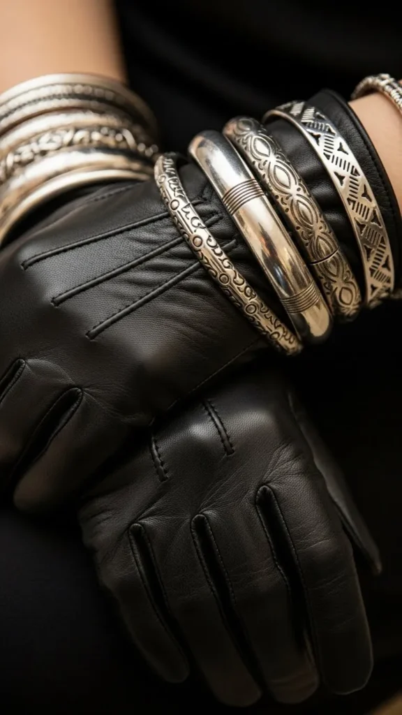 Leather gloves paired with bold bangles add an edgy touch. Wearing bracelets over gloves makes a fashion statement. Use costume jewelry to keep costs low. This look stands out with simple coats and slim pants, adding just the right amount of shine. If your gloves lack wrist space, opt for shorter bangles or rings worn over gloves.