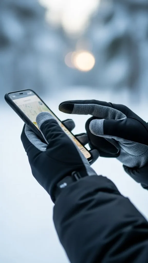 Tech-friendly gloves keep you warm and connected. Look for gloves with conductive threads on the thumb and index fingers. Pair these gloves with casual outdoor jackets or windbreakers. Budget-friendly options are common online and in stores. If you have gloves without touchscreen ability, a bit of conductive fabric paint can be applied to fingertips to add this function.