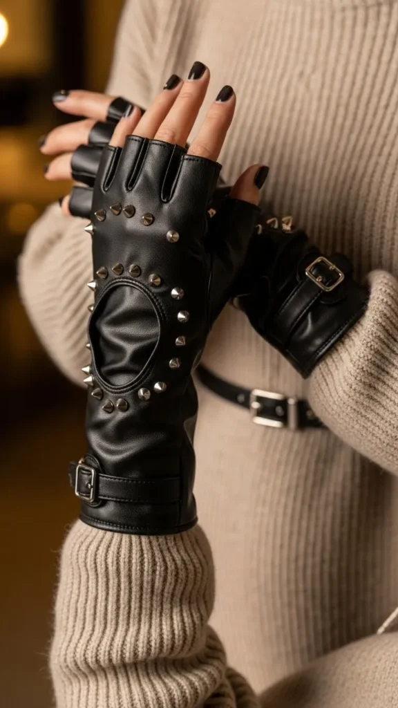 Pairing edgy fingerless gloves with soft sweater dresses balances toughness and comfort. You can buy inexpensive faux leather fingerless gloves online or repurpose old gloves. This combo works perfectly for casual nights out or cozy indoor settings. Add rings or wristbands over gloves for extra detail.