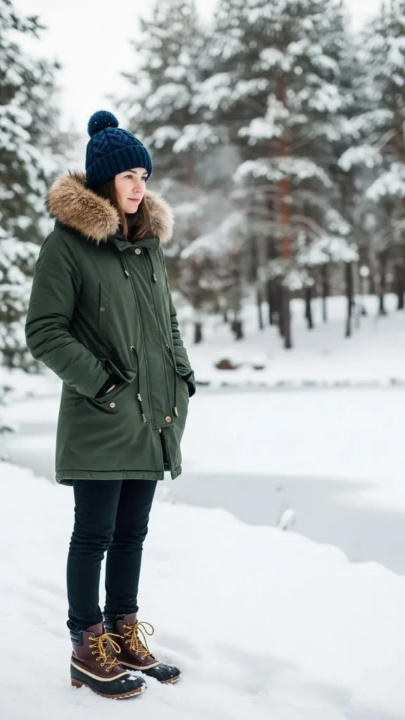 20. Cable Knit Beanie with Parka and Waterproof Boots