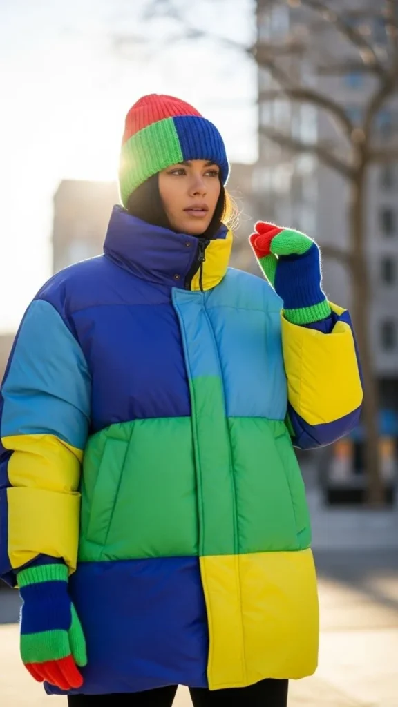 Colorblock puffy coats brighten winter gloom. Match your knit hat and gloves for a coordinated look that feels put-together. Look for budget sets in discount stores or make your own accessories using simple knitting or crochet patterns.