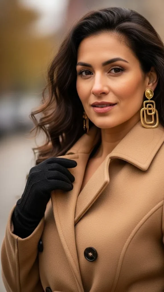 12. Double-Breasted Coat with Wool Gloves and Statement Earrings