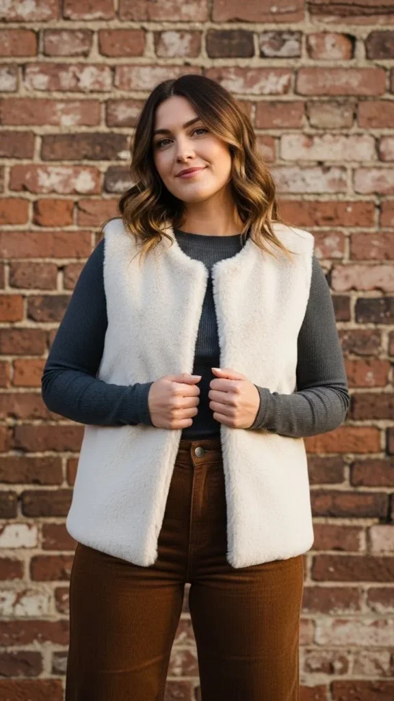 Faux fur vests give extra warmth and style without bulk. Layer one over a long-sleeve shirt or thermal top. Corduroy pants add texture and insulation for cold days. Faux fur vests are often on sale in winter clearance racks. Pair with a chunky belt for a customized look that feels cozy.