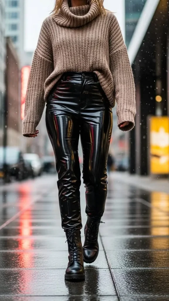 13. Faux Leather Pants with Oversized Sweater and Combat Boots