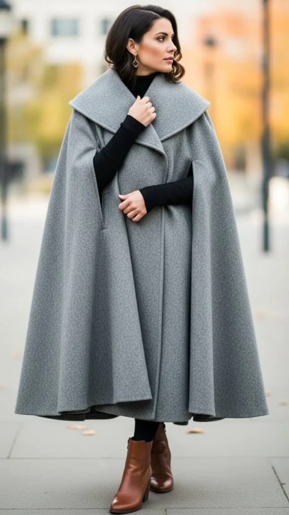 Capes are fashionable and easy to layer. A faux wool cape over a turtleneck offers warmth without restricting movement. Ankle booties keep your feet cozy and sharp. Capes can be sewn from thick blankets or bought cheaply in off-season sales.