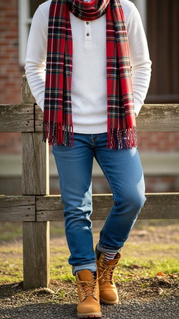 24. Thermal Henley with Jeans, Plaid Scarf and Timberland Boots