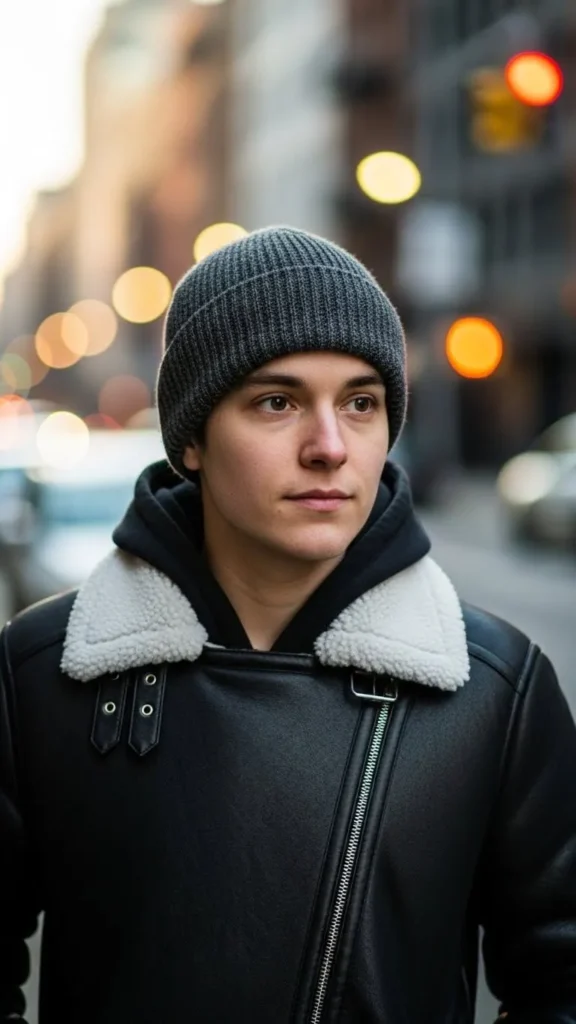 9. Leather Jacket with Faux Sherpa Collar and Wool Beanie