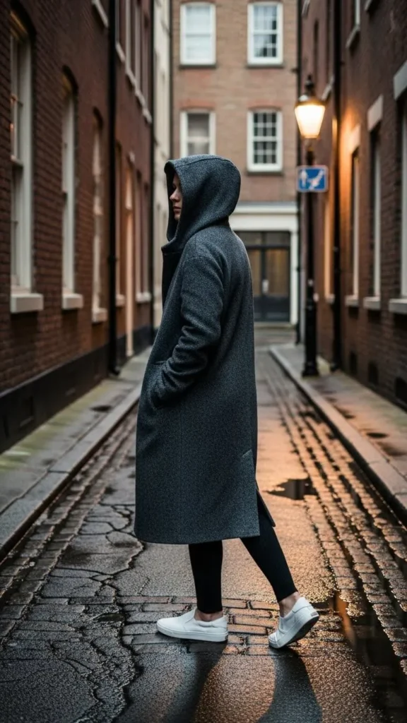 A longline coat with a hoodie underneath gives full coverage. Knit leggings add warmth without restricting movement. Slip-on sneakers keep it easy. This works well for casual outings or errands. Machine washable leggings are affordable and easy to care for, making it a practical choice.