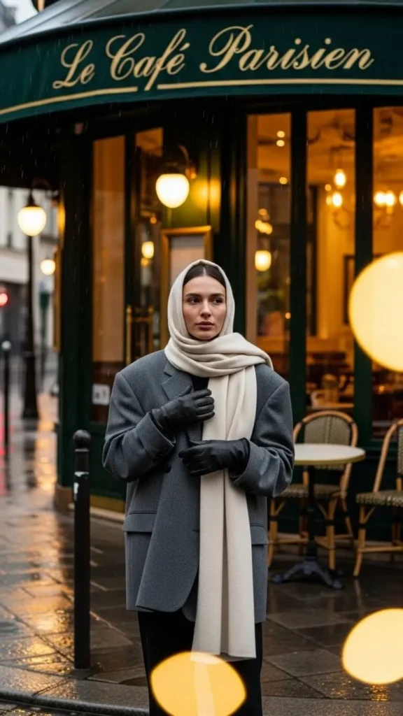 4. Oversized Blazer with Cashmere Scarf and Leather Gloves