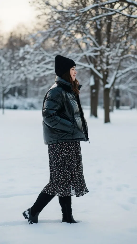 Try layering a puffer jacket over a midi dress. The jacket keeps out the chill. Tall boots protect your legs and add style. Look for last season’s puffer on sale or in consignment shops. For the dress, pick one in thicker material like knit or corduroy. This outfit blends girly and sporty with minimal effort.