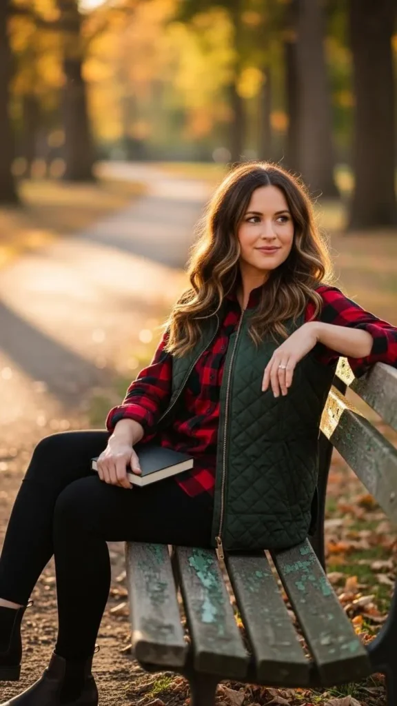 A quilted vest works great over a plaid shirt for a cozy, outdoorsy look. Thermal leggings keep legs warm without bulk. This combo is budget-friendly and great for casual outdoor outings. Look for insulated vests on clearance, or layer lighter vests underneath a heavier coat if needed.