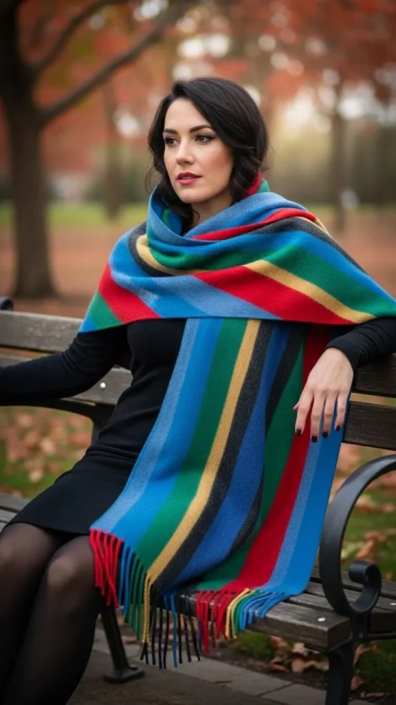19. Striped Oversized Scarf with Long Sleeve Dress and Tights