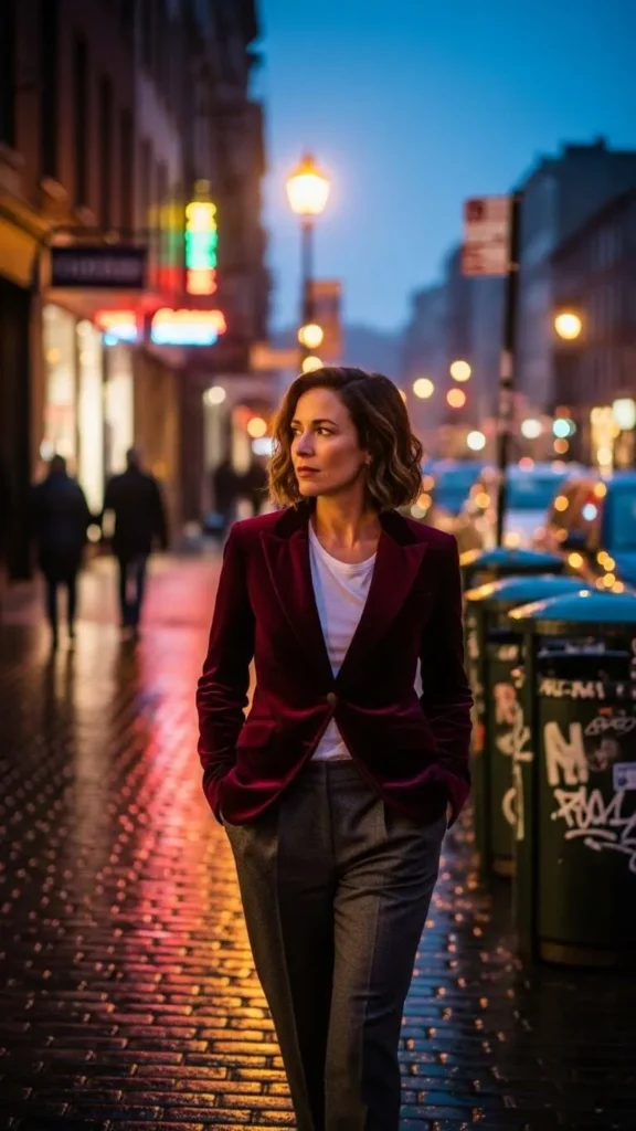 Velvet blazers bring a soft touch of elegance. Keep it casual underneath with a simple tee and wool trousers. Wool pants keep you warmer than jeans in the cold. Look for wool blends on sale and try dyeing thrifted blazers faux velvet colors to refresh them.