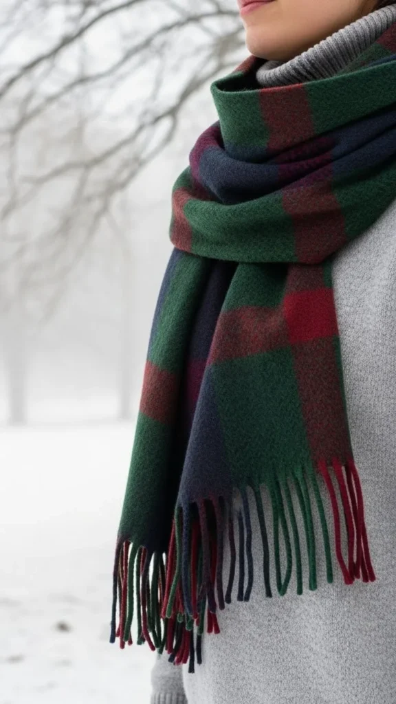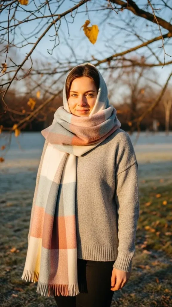 Grey sweaters make excellent backdrops for patterned accessories. A plaid scarf in muted tones adds warmth and personality while still looking modern. Oversized scarves are easy to find at good prices and can upgrade basic knits instantly. Try tying your scarf in loose knots for casual style or draping it over shoulders for a polished vibe. This outfit is approachable and adaptable for many winter occasions.