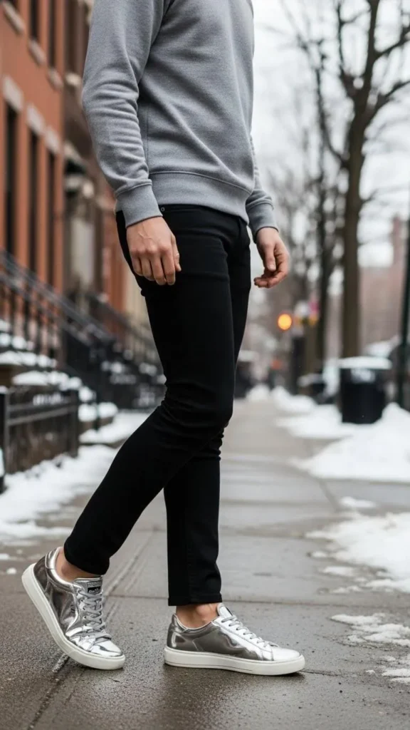 Heather grey sweatshirts are basic but stylish. Pairing one with black jeans keeps it simple. The finish comes from adding statement metallic sneakers. You don’t have to splurge on footwear—many brands offer budget-friendly metallic options that elevate without overdoing it. Keep jewelry minimal to avoid clash. This outfit is practical and lively for weekend gatherings or casual workdays.