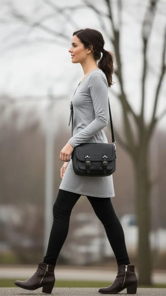 Long grey tees layered under coats or sweaters extend warmth while keeping shapes streamlined. Wearing one over black leggings creates a lean silhouette. This look is easy and low-cost since basic tees and leggings are widely available at mass retailers. Stick to heavier cotton or cotton-blend tees for better insulation. Add high boots or sneakers to finish the outfit. A long tee also works nicely for layering under oversized sweaters.