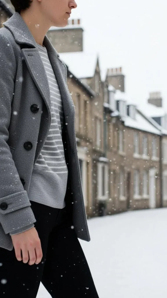 A striped grey and white shirt adds visual interest under solid grey outerwear. Pea coats are classic winter essentials for layering. The mix of stripes with solid greys adds depth without losing minimalism. Shirts are budget-friendly and often on sale. Choose breathable fabrics for layering. Combine with tailored trousers or jeans for a neat winter look. Add a plain wool scarf and simple gloves for contrast.