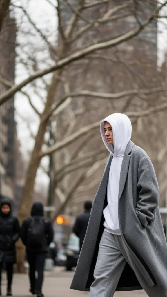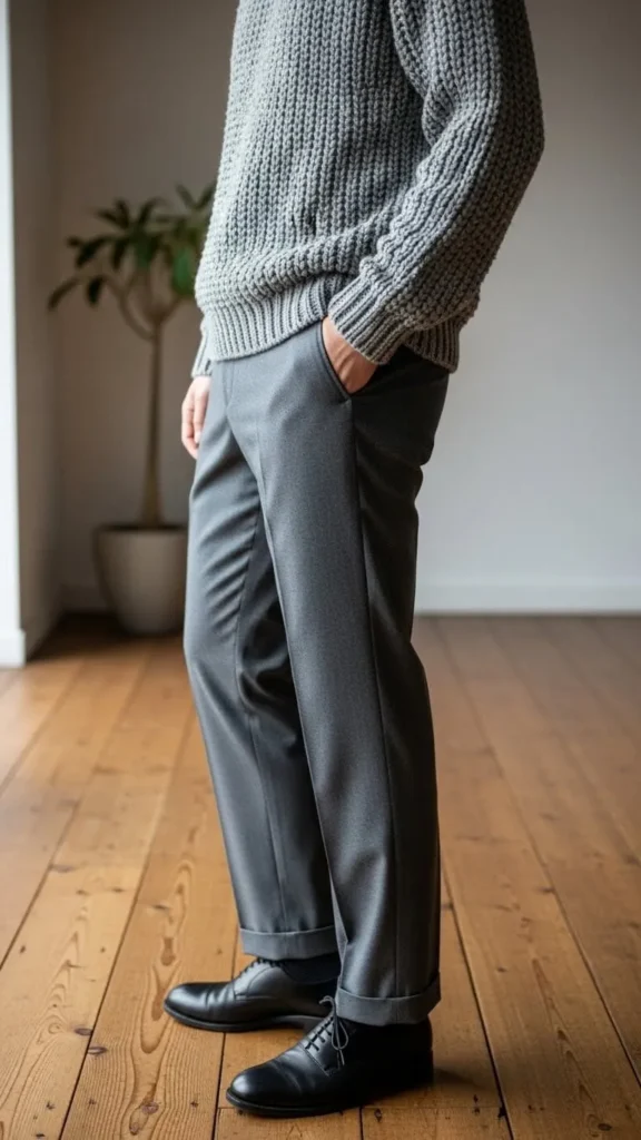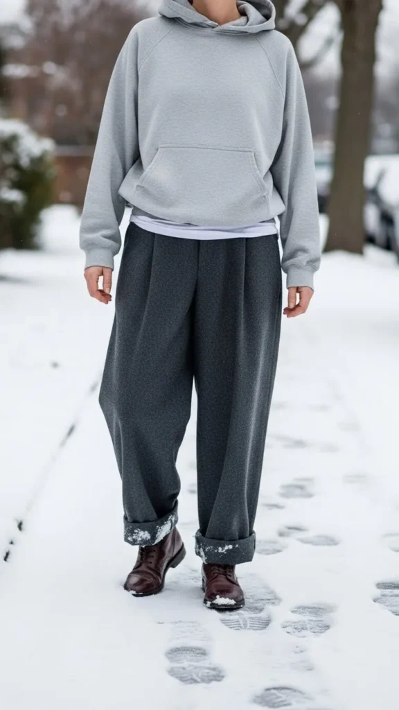 Wide-leg wool pants in dark grey bring sophistication to casual sweaters or hoodies. A pale grey hoodie balances the heaviness of wool with softness. This is great for days when you want comfort but still look put together. You can find wool pants secondhand for less—just check for moth holes. Experiment with tucking in the front of your hoodie to define your waist. Add simple sneakers or loafers to complete the look.