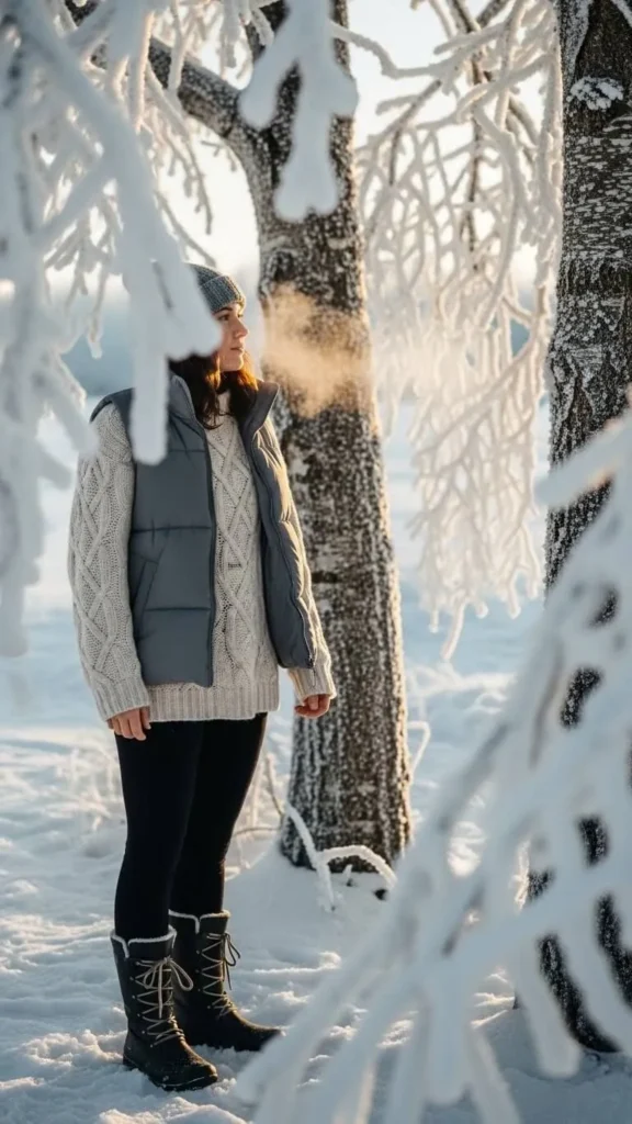 Puffer vests offer warmth to the core without full bulk. Choose a soft grey vest layered over a chunky sweater for diverse texture. This outfit is functional for outdoor winter activities like walking or errands. Budget versions of puffer vests come around regularly during sale seasons. Mix with black leggings or warm pants. Add winter boots and maybe a beanie for full coverage.