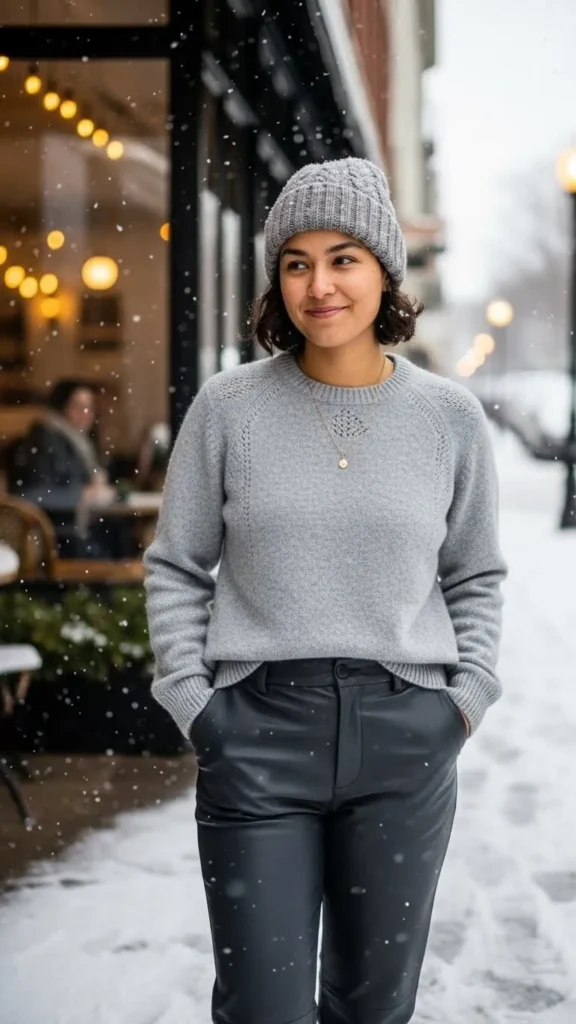 7. Soft Grey Cashmere Sweater and Leather Pants
