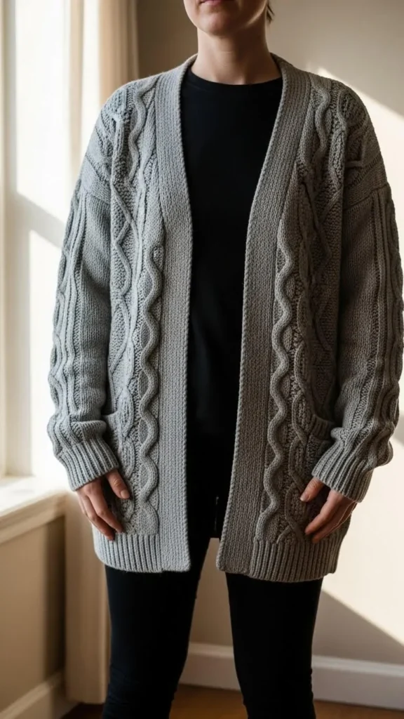 Cable knit cardigans bring cozy texture to an outfit. A light grey cardigan layered over a longer black tee and leggings can be a go-to for lounging or quick outings. Keep it affordable by swapping in cotton blends. Add wool socks and simple sneakers or slip-ons. For a quick DIY twist, sew on your own buttons or add a patch for personality. This look feels relaxed and warm, perfect for casual winter days.