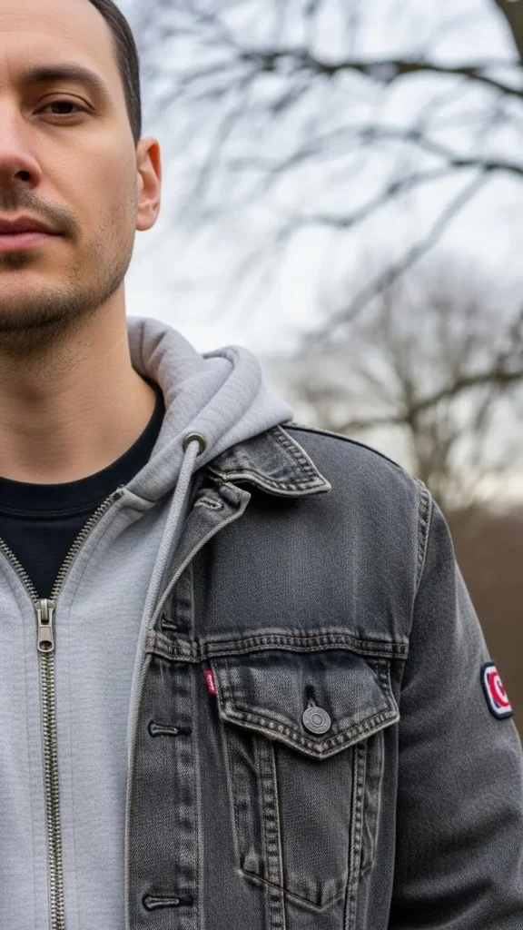 Grey hoodies layered with a worn denim jacket create a casual modern outfit. The different textures work well in similar grey tones. Choose a hoodie with a relaxed fit and zip-up style for easy layering. Use a darker grey or charcoal jacket on top for contrast. Jeans or cargo pants complete the outfit. This look is budget-friendly; check local thrift shops for denim jackets—they age well and often cost less.