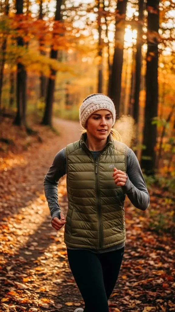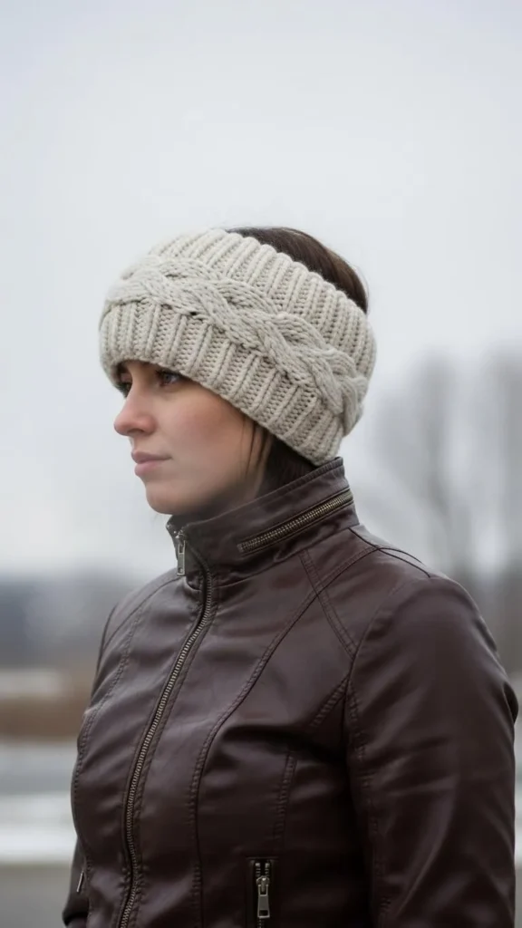 For active days, a thick knitted headband keeps ears warm without full hat coverage. Combine with a puffer vest and leggings for easy layering. Headbands are fast to knit and cost less than hats. This look is perfect if you like outdoor walks or running in cooler temps.