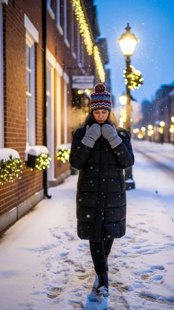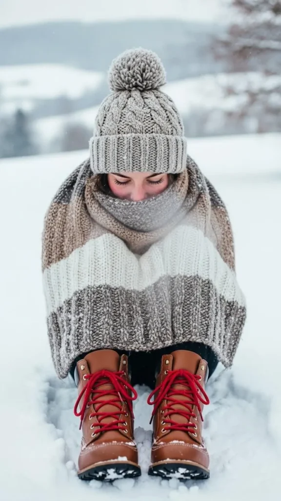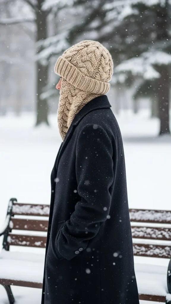 A thick cable knit hat brings texture and warmth to a classic wool coat. You can often find cable knit hats secondhand, or try DIY knitting with simple patterns. This combo works well for work commutes or holiday outings and keeps a classic vibe without extra expense.