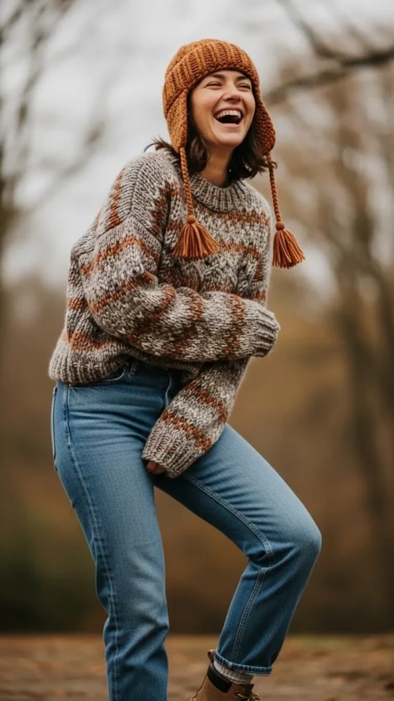 Earflap hats with tassels add character and extra ear coverage. Pair yours with a chunky sweater and jeans for a casual, comfy look. If you’re on a budget, repurpose old sweaters to make fringe or pompoms for your hat for a fresh feel.