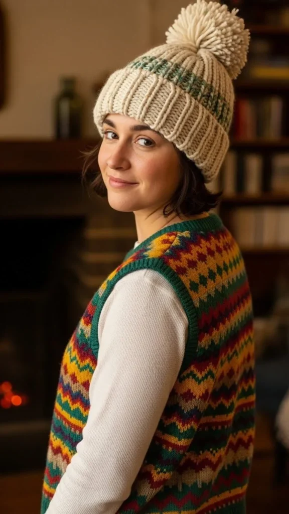 Pom pom hats bring playful contrast to vintage sweater vests. Layer a long-sleeve tee under the vest to stay warm and casual. This style is unique, inexpensive, and full of charm. Use craft pom poms to update older hats.