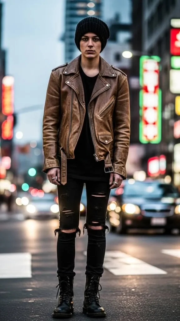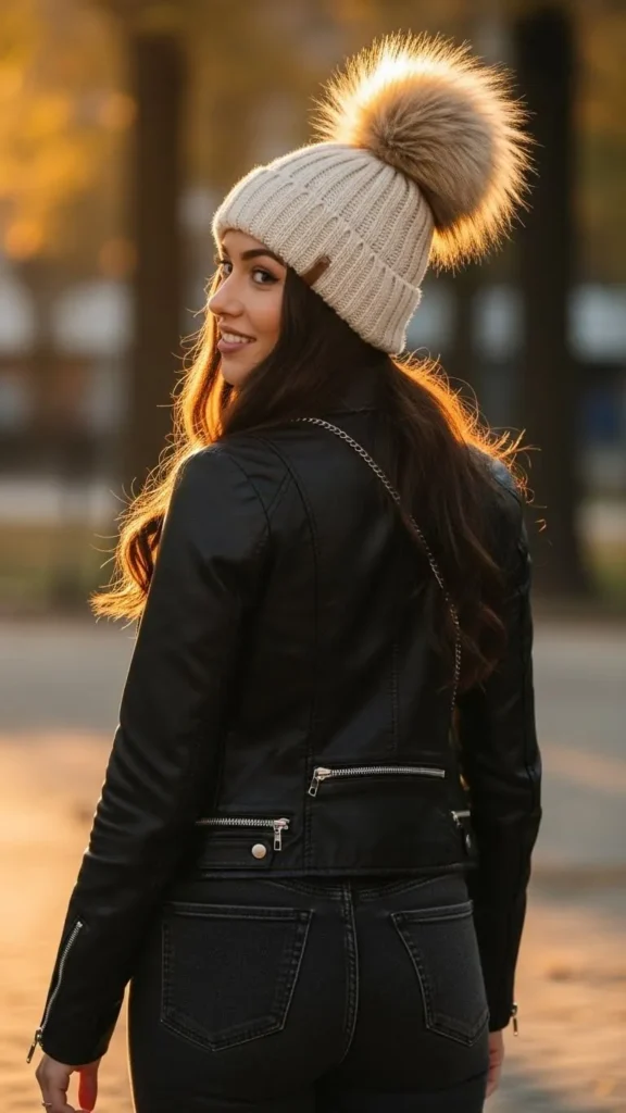 A black knit beanie fits right in with a tough leather jacket and chunky combat boots. It’s a classic cool winter combo. You can easily find budget beanies at local shops or online. This style balances warmth with urban edge.