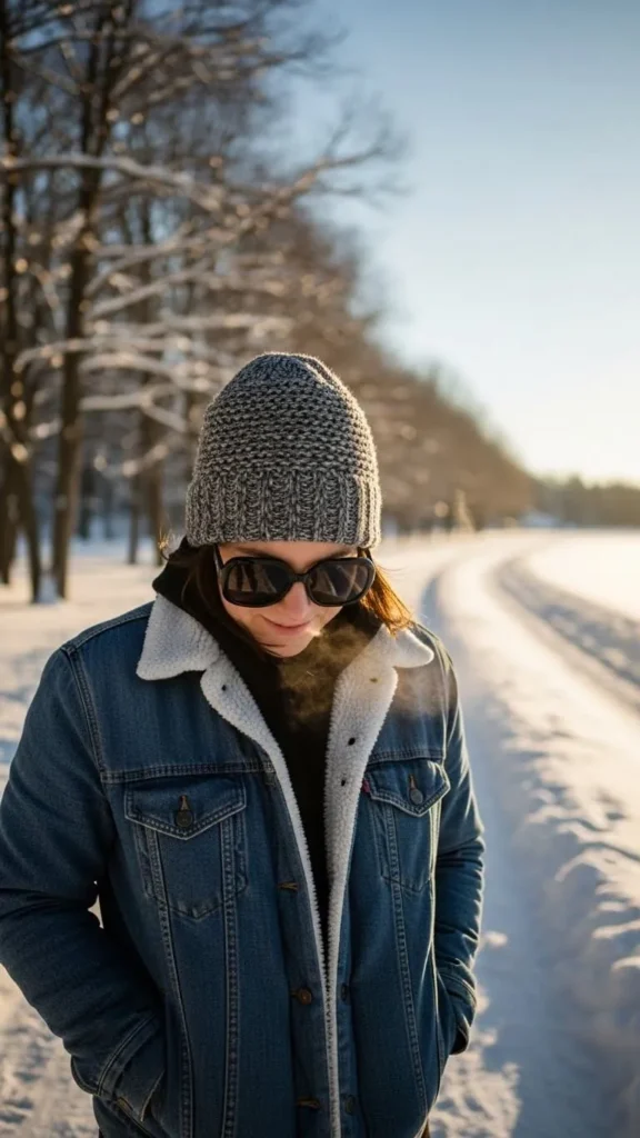 For sunny but cold days, pair a knit beanie with sunglasses and a warm-lined denim jacket. This combo is great for casual weekends. The beanie is affordable and easy to throw on, while sunglasses add style and shield from glare.
