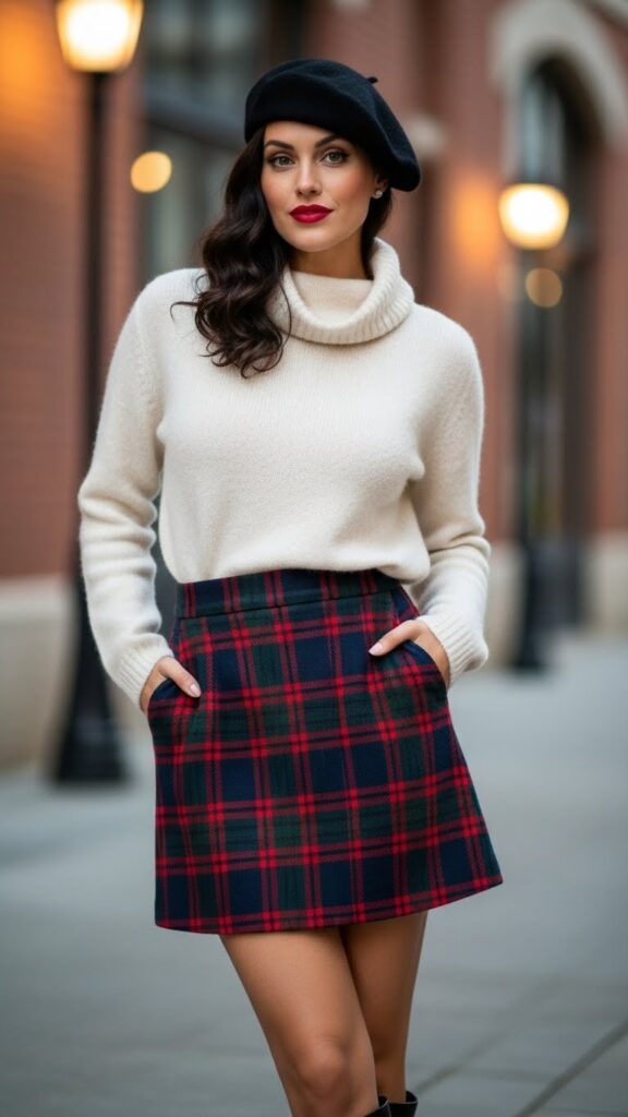 Wool berets bring Parisian charm to a winter outfit. Try pairing with a fitted turtleneck and plaid skirt or trousers. Many berets are inexpensive and easy to find. This look suits casual dates or daytime outings and helps mix cozy and chic.