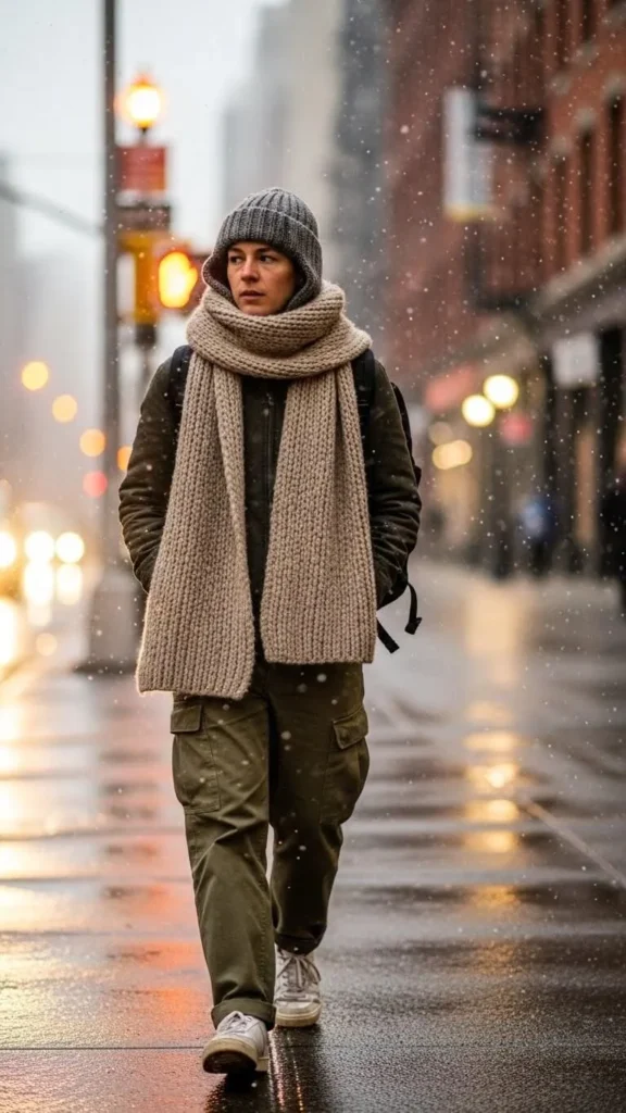 21. Ribbed Cuff Beanie with Thick Scarf and Cargo Pants