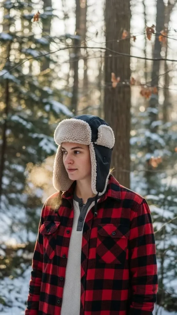 Trap hats lined with faux shearling give an outdoorsy rustic vibe. Pair with a soft flannel shirt and layers beneath for warmth. Check discount stores or DIY by sewing fleece-lined earflaps onto a basic hat. This outfit is comfy for hiking or casual winter errands.