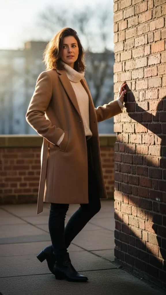 A camel coat is timeless. Pair it with dark denim for a sharp, polished look that feels expensive. Add simple accessories like a black leather belt or gold hoops. This outfit works for casual days or meetings. Want to DIY? Thrift shops often have great camel coats. A quick steam and minor tailoring will make it feel custom. Keep the jeans clean and cuffed for extra style points. Affordable, easy, and chic!