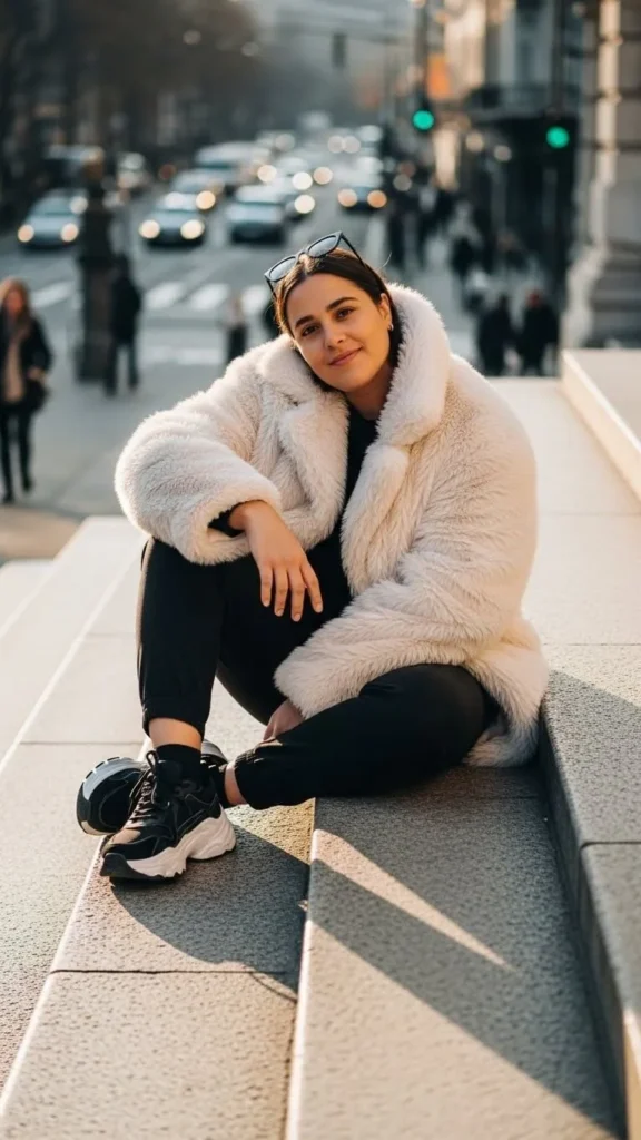 Faux fur feels luxurious without the price tag. Throw it over joggers and statement sneakers for a trendy, elevated casual outfit. Balance the softness of the coat with simple, sporty bottoms. Joggers don’t have to be expensive—try thick sweatpants or track pants on sale. Accessorize minimally since the coat commands attention. Ideal for weekend errands or coffee dates.