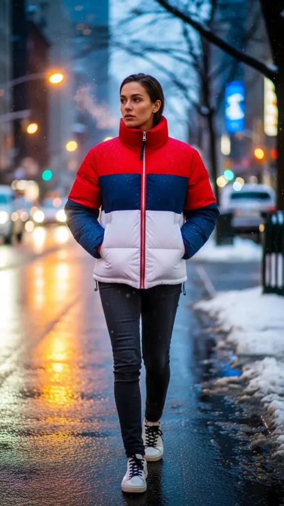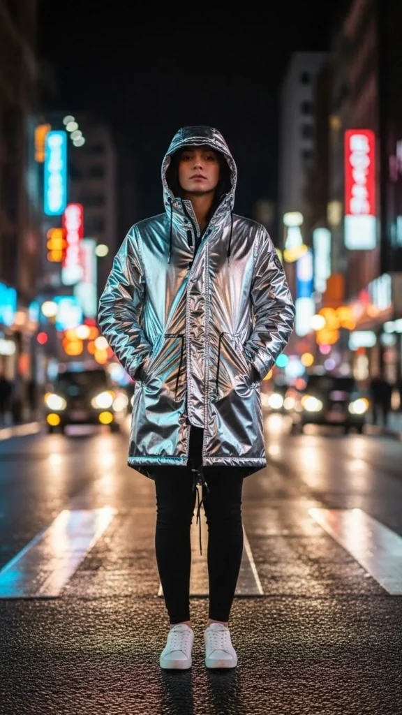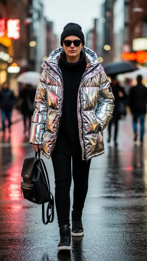 Metallic puffers make a statement but can still look pricey when paired simply. Keep the pieces underneath basic: black turtleneck, leggings, and sneakers. This reduces the “too much” feel and keeps it balanced. For cheap, look online or in outlet stores for sales on metallic outerwear. DIY shine effects with spray fabrics can update a plain puffer in minutes.