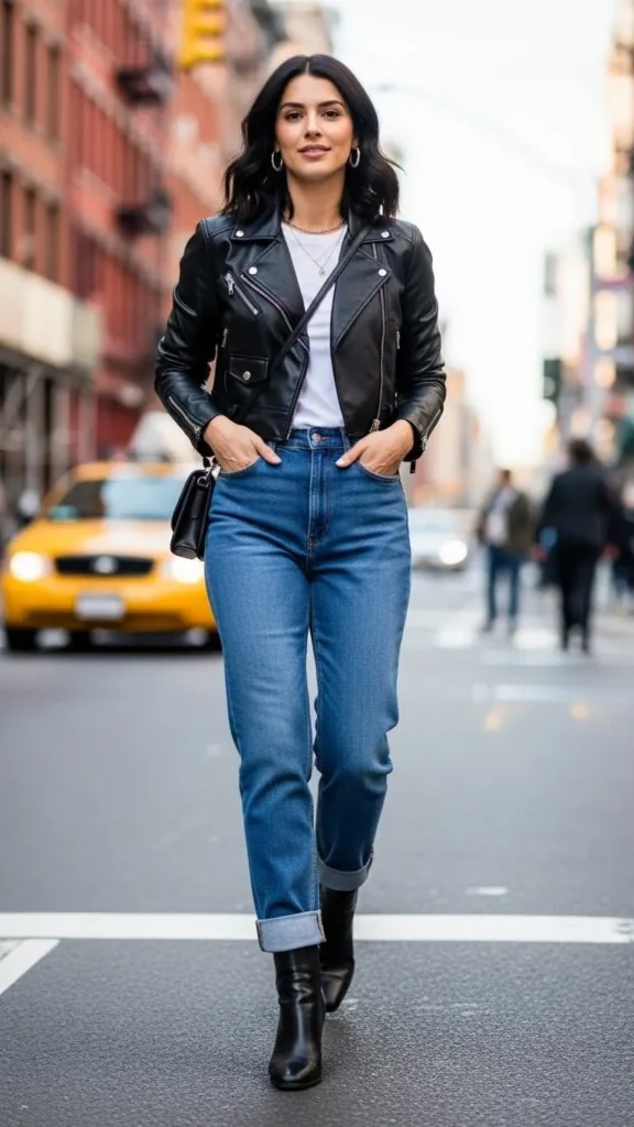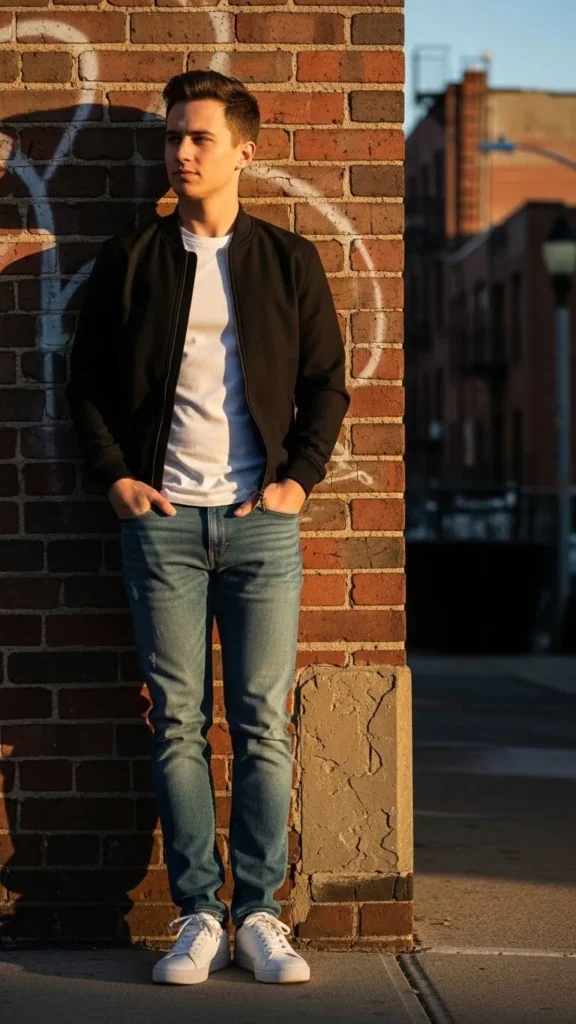 6. Sleek Black Bomber Jacket with White Tee and Jeans
