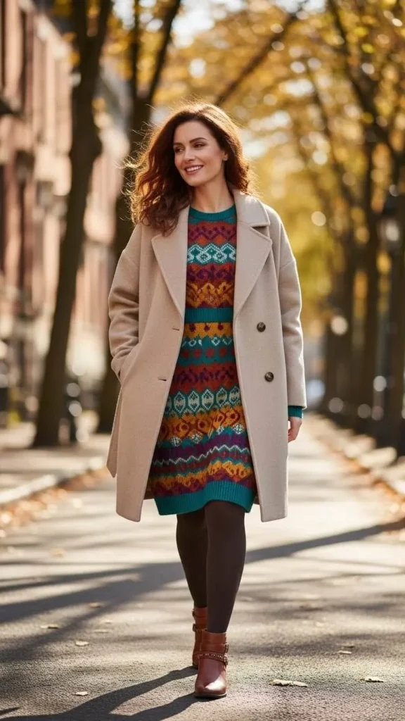Add a wool coat over a knit dress with fun patterns for a layered luxe look. The contrast between soft wool and bold prints keeps the focus on your outfit. Knit dresses are often budget-friendly, especially in clearance sales. Finish with tights and ankle boots for warmth and style. Roll the coat sleeves slightly for a relaxed vibe. Accessorize with simple earrings for balance.