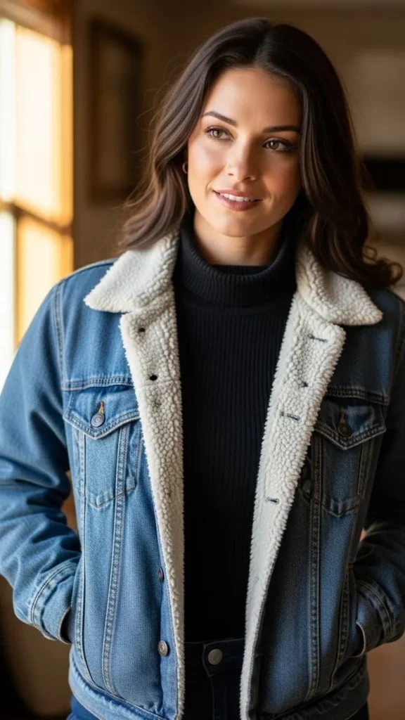 Denim trucker jackets with faux fur lining feel trendy and cozy. Layer over a fitted turtleneck for added warmth and style contrast. These jackets often come in light washes but look pricey with the fur trim. Pair with black pants or jeans for a monochrome effect. Good for casual weekends or lunch dates. Check online sales for affordable styles.