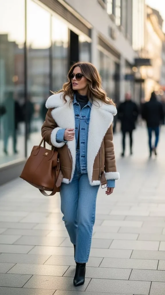 Shearling jackets have a natural luxury vibe. Combine it with denim layers underneath for texture. Try denim jackets in a shade lighter or darker than your jeans to break monotony. Round off with suede boots or leather sneakers. For budget finds, look for shearling-lined jackets in thrift stores or online vintage shops. Always try to condition the leather to keep it soft and polished.