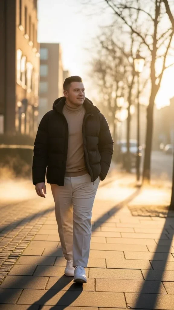 Puffer jackets are trendy but often bulky. Choose a slim-fit style in *black or navy* to keep it sleek. Underneath, wear neutral sweaters and pants to balance the volume. Layer a turtleneck for warmth and style. This outfit looks effortlessly chic and is great for everyday wear. For a budget-friendly version, repurpose an old puffer by adding custom patches or switching out bulky zippers for slimmer ones.