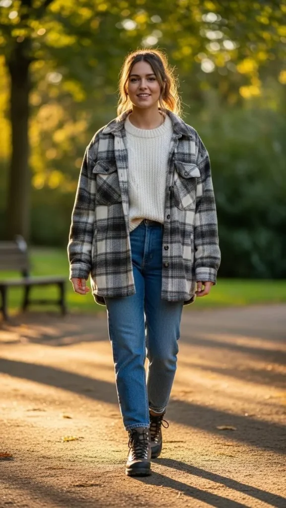 Flannel jackets add warmth and texture. Opt for an oversized fit for a relaxed look. Layer it over a chunky knit sweater in neutral tones. This combo is budget-friendly since flannel and knits can be found affordably secondhand. Roll up the sleeves to show the sweater cuffs. Add rugged boots or sneakers to finish. Great for casual weekends or outdoor activities.