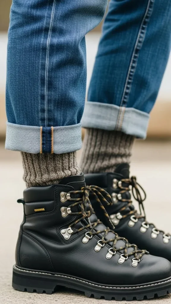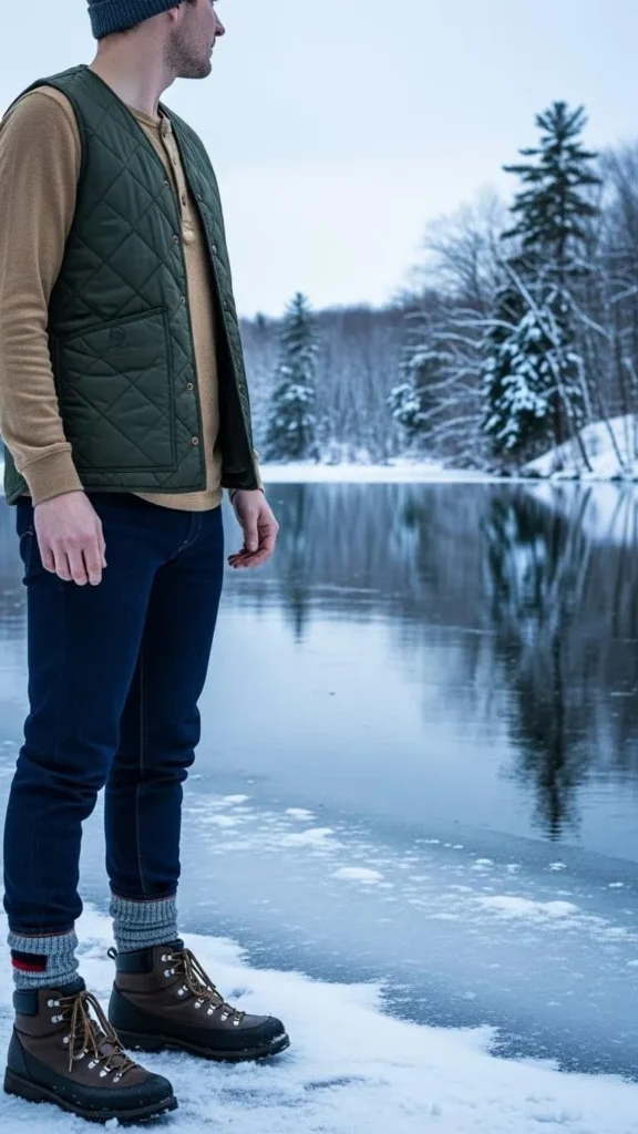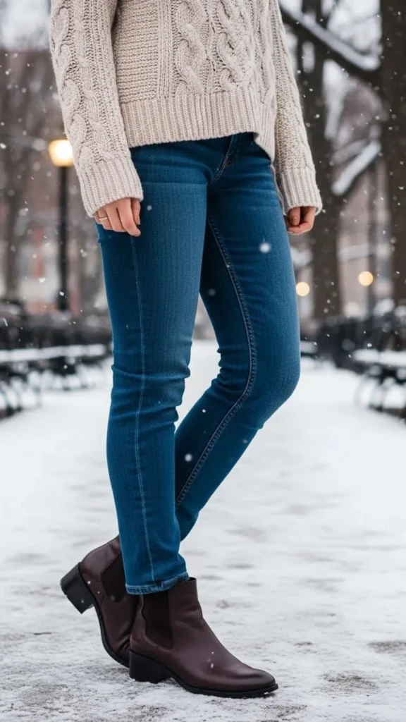 Roll your straight leg jeans up a half inch to show warm wool socks. Pair with durable chunky boots for protection from snow and cold. This outfit balances warmth and style perfectly for outdoor walks or casual weekends. Wool socks are inexpensive and can be layered for extra warmth if needed.