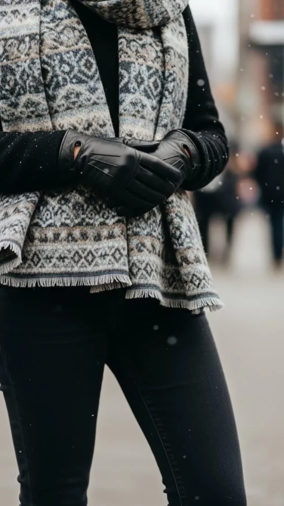 9. Black Jeans with a Patterned Wool Scarf and Leather Gloves