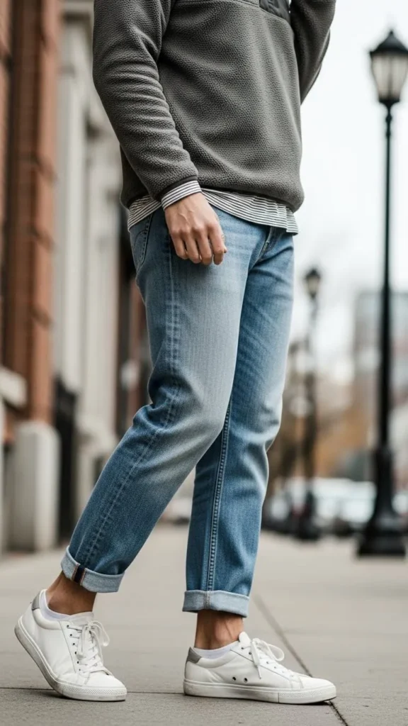 Use your boyfriend jeans rolled above boots or sneakers. Layer a thin thermal or long sleeve tee under a funky patterned pullover. Add simple accessories like a knit hat or wrist gloves. This outfit is casual yet polished and perfect for quick errands or coffee runs. Rolling up jeans to reveal socks adds a playful touch and keeps toes warmer without bulk.